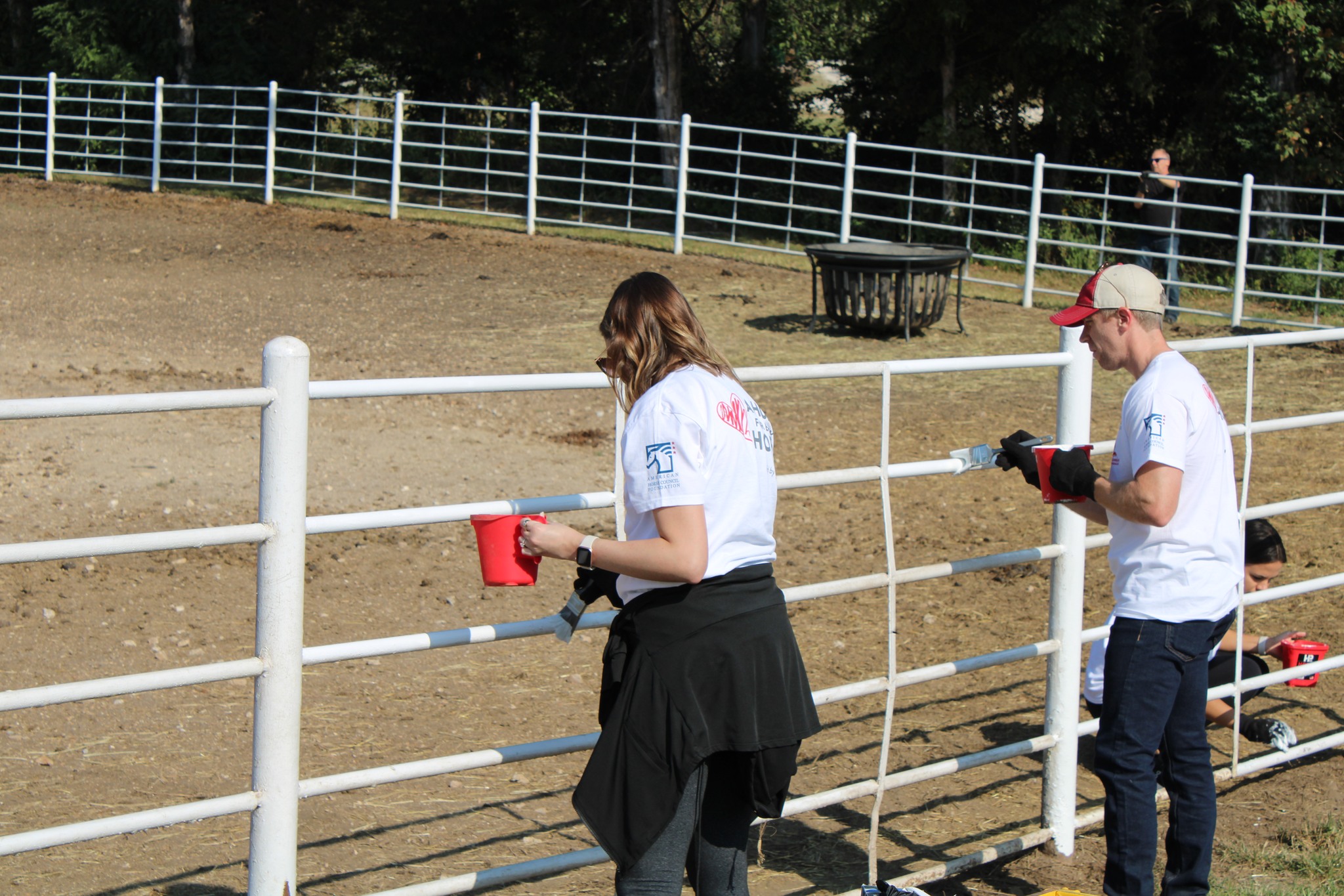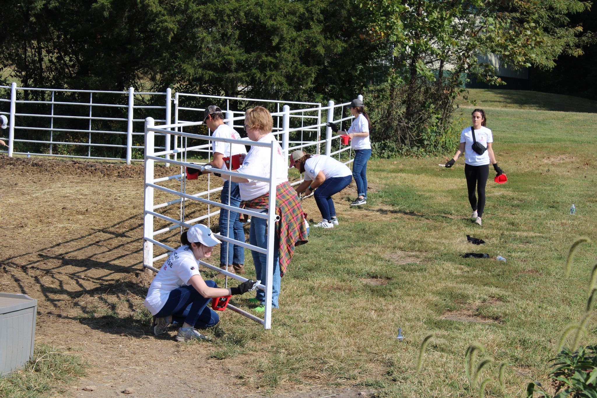 Over 100 employees from these three organizations joined our staff and animals for a long day of hard ranch work! With their help, our paddock fences were painted, our pasture fences were cleared of brush and broken limbs, and our horses got brand new hay feeders. One of the Budweiser Clydesdales, named Champ, took a field trip out to visit with our staff and take photos. Viktoria, one of the Clydesdale handlers and a former Longmeadow employee, surprised the staff as well! It was so great for us to see an old friend, and to meet Champ!